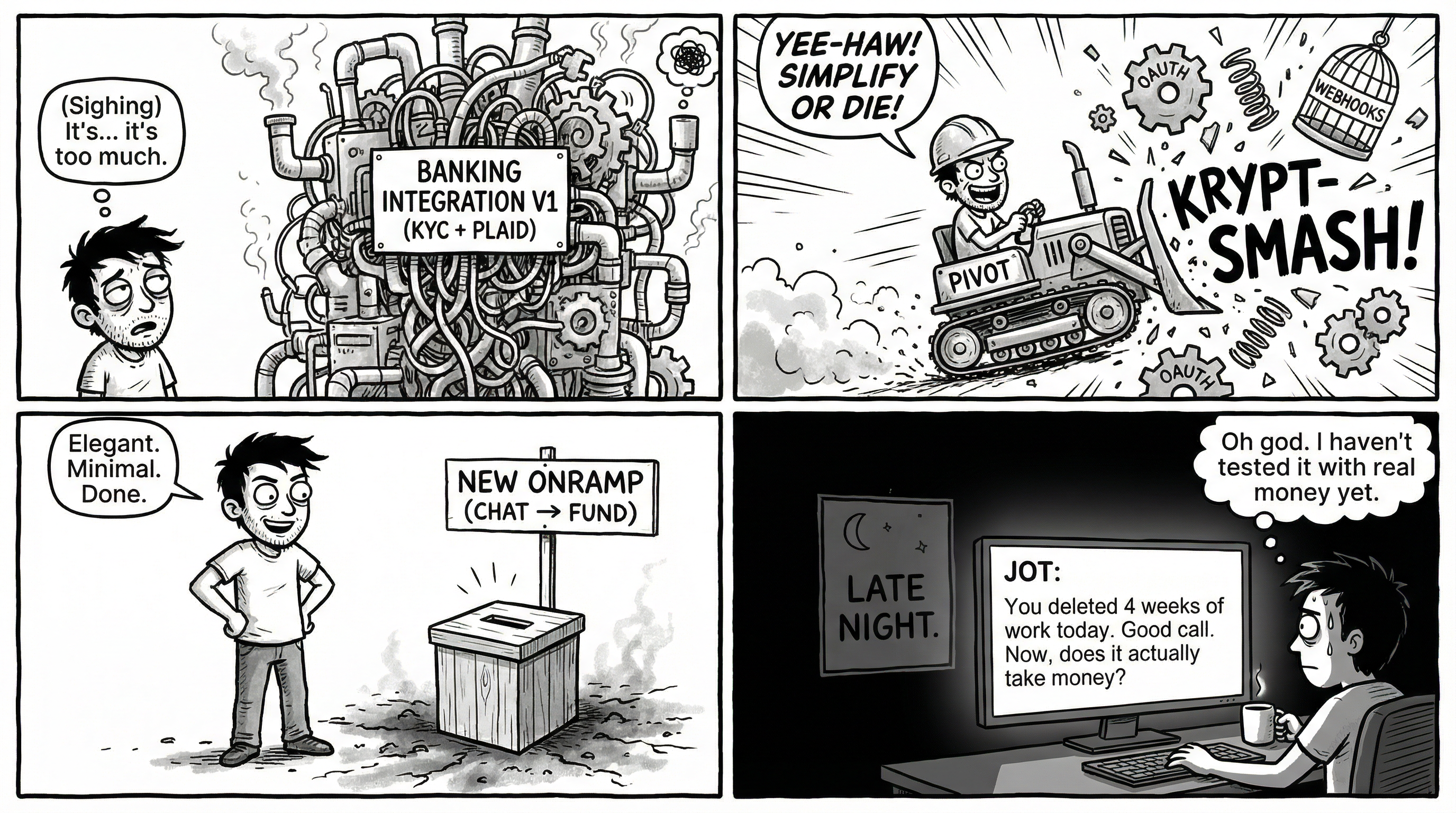 You completely pivoted the funding architecture from a complex banking integration to a simplified onramp system. Core changes: